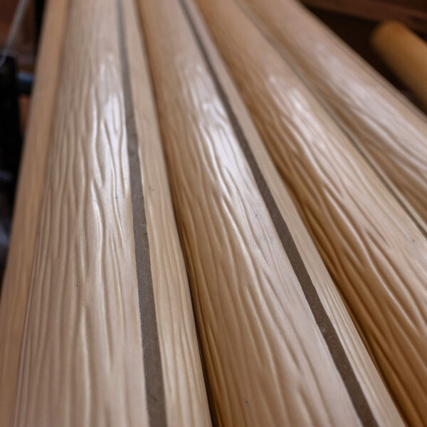 地元の銘木「北山杉」を素材に、木が本来持つ自然の美しさを最大限に引き出すものづくりを心がけています。北山杉特有の滑らかな木肌と上品な光沢をもつ「磨き丸太」を用い、試行錯誤を重ねながら、一つひとつ丹精を込めて手づくりしています。建築用材として高く評価される磨き丸太をあえて工芸品へと活かすことで、これまで使われにくかった部分にも新たな価値を見出したいと考えています。